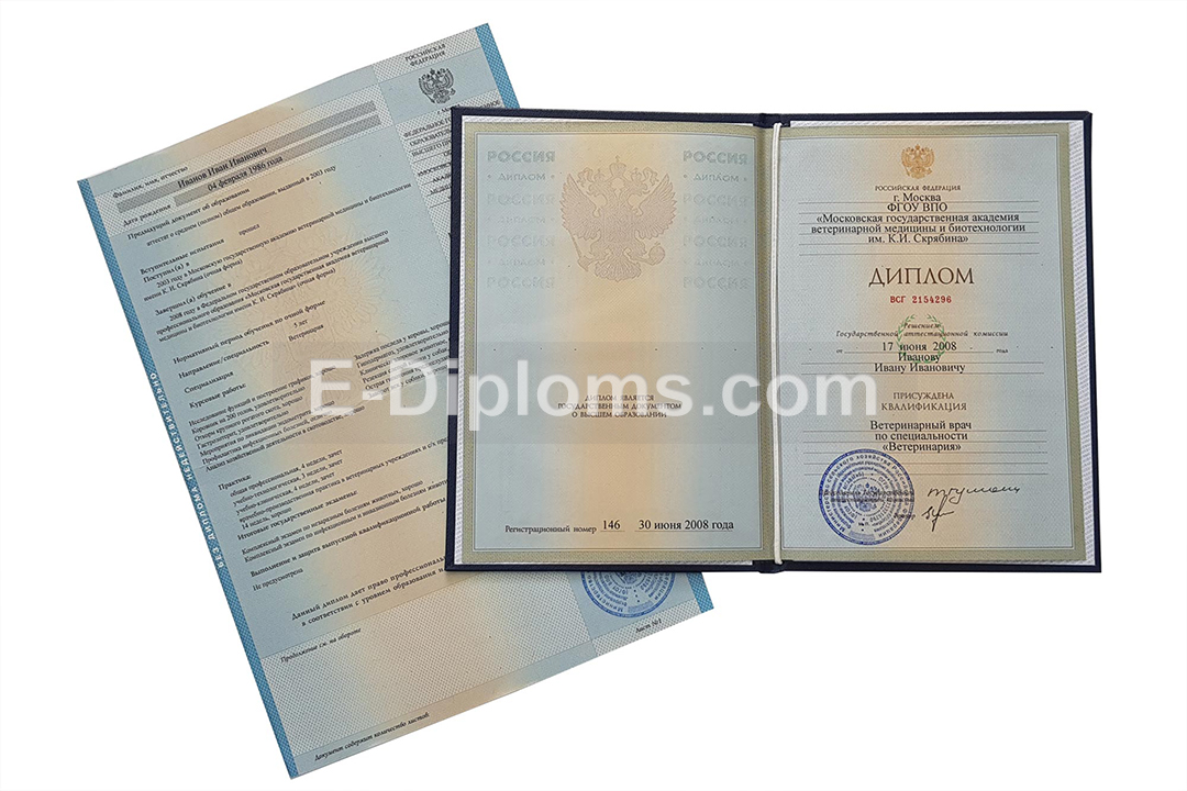 Дипломы на таких же бланках, которые получали выпускники ВУЗов России с 2004 по 2009 года включительно. Учебная программа и все данные по образовательной организации соответствуют периоду; ставим гербовую «мокрую» печать и подписи, как в оригинале.
